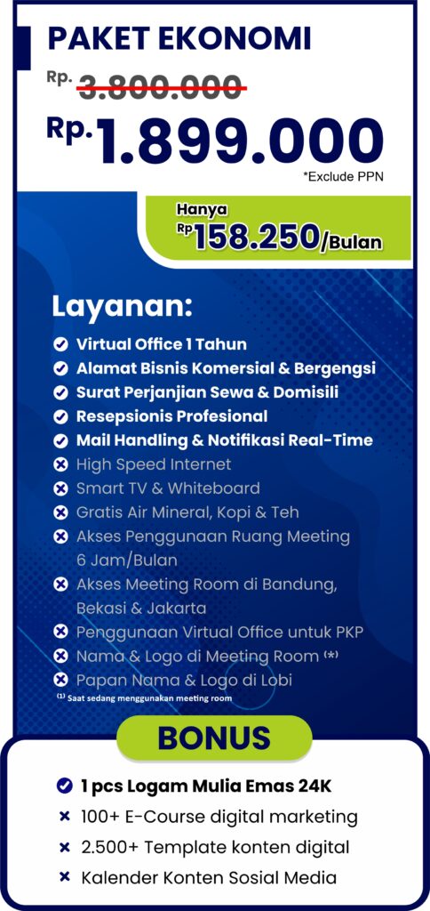 Virtual office bandung yaitu salah satu penyedia sewa kantor virtual termurah dan bisa melakukan PKP. Dengan fasilitas kawasan yang lengkap bersama brand – brand ternama seperti KFC, Hokben, Chatime selain itu lokasinya sangat strategis karena dekat tol sumarecon dan kereta cepat whoosh.