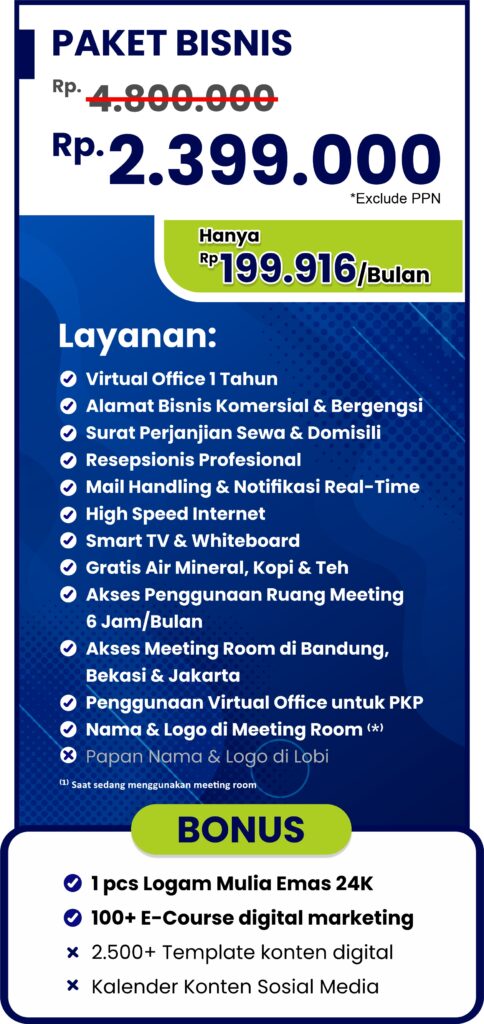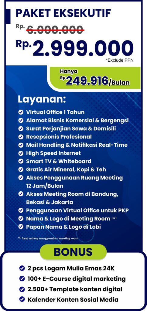 Sewa kantor virtual adalah layanan yang menyediakan alamat bisnis resmi, penerimaan surat, dan fasilitas kantor lainnya tanpa harus memiliki ruang kantor fisik.